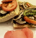 This is a great sandwich full of rich flavors from the sauteed veggies, walnut pesto, grilled bread and a balsamic reduction. Use your favorite bread and ENJOY!